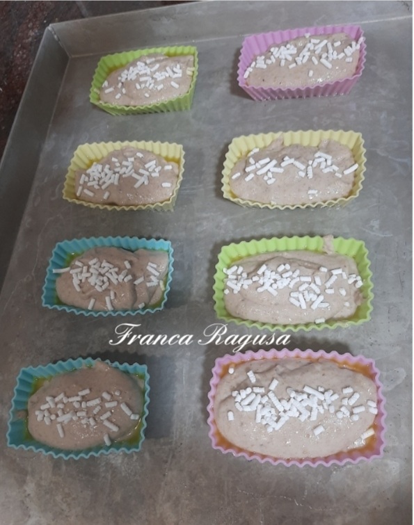 - Riempire fino a metà i pirottini per plumcake monoporzione, aggiungere la marmellata ai frutti di bosco e ricoprire con il composto senza arrivare ai bordi.